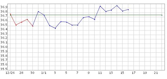 CYCLE DAY 16 36.65 高温期03日目・・・のハズ今朝目覚めると微妙に寒いそして外は真っ白・・・どうやら朝方 雪が降った模様。チラチラ舞うことはあったけど「あ,雪降ったんだ!」ってのは,自覚してる限り今シーズン初めて(だと思う)そのせいか・・・?今朝はストンと体温が下がっちゃった。測りなおしてみても同じくらい(0.02上がっただけ)実はまだ高温期じゃなかったのか???測定中に口が開いてたのか!?(←たまにやる)私の(今周期の)平均体温は36.72。(プチソフィアで表示されてる。)んで,過去6週期分をみてみたら36.70~36.73の間をうろちょろ。そんなわけで私のプチソフィアでは周期16日目にしてまだ低温期表示中(;゚ ロ゚ )昨日,おとといとちょっと上がってるんだけどなぁ。(で,勝手に高温期にした)2日だけで高温期終了,なんてことないよね(まさか)なんだかなーーー昨日の朝やってみた排卵検査薬の結果は8日とほぼ同じ濃さ。あれ?消えてないや。(ってか薄くなってないよ・・)あと排卵検査薬も残り2個なので次は今週末に実行してみようと思います。やれやれ・・今周期は不思議なことばかり(;´д` )どうなることやら・・・滝汗2005年12月26日~の基礎体温をみる(*^ー^*)