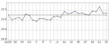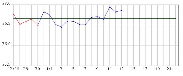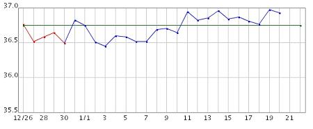 CYCLE DAY 19 36.86 高温期06日目もう今周期も19日目になるんですね~☆今朝はいい夢を見たことだし,一日の始まりが快適です(←単純)さて,今周期から入力していた基礎体温表(今のところKTOと併用)ABC基礎体温 → KTO と使ってきましたが,なかなか気に入るようなグラフが出来なくて・・・いざとなったら夫くんに頼んで作ってもらおうかなぁ~なんて考えていたのですが。そんな時,出会ったのが【ウーマンコム】というところでした。検索してみるものですねヽ(・∀・)ノさっき,グラフの画面を出してみたらシンプルで見やすいかも!!ということで,初めて基礎体温図をUP。年末年始(まさに12/31,1/1)の発熱のせいか平均体温が高め?やっぱりグラフにしてみると見やすいなぁ(^▽^)どうか新しい基礎体温表を作るのは今周期で終了しますように(-人-)南無~ 昨日の身体のことφ(・・。)ゞ おりもの:ちょこっと気になるくらい下 腹 部:たまに重苦しいような感じ相変わらず快便!2005年12月26日~の基礎体温をみる(*^ー^*)