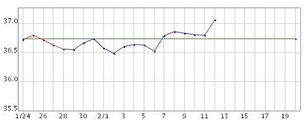 CYCLE DAY 22 37.04 高温期08日目体温はいい感じ~~(^▽^笑)一週間後にはフライングできるかなっ♪しかし・・高温期8日目を迎える今日 今現在表立ったそれらしい兆候なし前周期の今頃・・・下腹部(右側)の痛み や 足の付け根痛脇下痛み(乳腺のあたり)とか胸の張りなんてことを書いているんだよね( ̄ェ ̄;)今?・・・なーんにもないや・・・滝汗まだ8日目だからか???とりあえず体温キープだからよしとしましょう♪さて,午前中は用足しに出かけていました。郵便局とスーパーへ( ̄∇ ̄*)ゞしばらく前に通帳がいっぱい(否 残高w)になって新しいのを作ってもらったの。その時に「いつでもいいので登録している印鑑を持ってきて下さいね」なんて言われたんですが・・わちゅれてた!!!(←誰だよ)んで,天気もいいし 大安だし・・の~~んびり歩いて行ってきました。銀行系はとっくに照会印廃止になってるのに郵便局はいまだにあるんだね~。(大丈夫なのかしらん)そのまま てくてく歩いて駅前のスーパーに着いたのが10:15。ココには宝くじ売り場があるんですが,開店(?)は10:30だって。ふと思い立って,そのまま18分ほどスーパーをうろうろして10:28過ぎに売り場へGO!ちょうどシャッターを開けているところでした♪快晴で大安で・・確か六星占術でも良さげだったはず。一番最初に窓口に並んで「グリーンジャンボ」購入ヾ(〃^∇^)ノ♪イチバーーンついでにスクラッチを見てもらったら(削ったやつを溜めてたのw)5枚中2枚あたりで600円なりーーーー☆なんだか満足して振り返ると・・うひゃあ・・長蛇の列ができている。しかも・・じじばば ばっかり 汗汗汗↑かなり びっくりした。どうか どうか 当たりますように(-m-)” パンパン 体調Memo おりもの量 普2/13 夕方下腹部痛2/13 23:00就寝寒くて寝付き悪-2006年01月24日~の基礎体温をみる(*^ー^*)