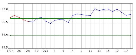 CYCLE DAY 15 36.79 高温期01日目うひゃ~~!恐るべし基礎体温!!昨日卵チェックに行ってすでに卵液しか確認できなかったわけですがヽ(・∀・)ノ予測どおり本日より高温期に突入いたしました~~(^▽^笑)偶然でなければやっぱり私のサイクルは周期14日~16日頃に排卵なんだな。ってことは・・今までも仲良しのタイミングは合って・・いたのか?でも・・できなかった・・・?( ̄、 ̄*)ま・・まぁ・・今週期から一通り検査を受け始めているからね。何かあれば治療できるし!近々 夫くんの○~ チェックも強行しますので乞う・ご・期・待(*^-^*) ←なんか違っ!!そうそう,昨日からサラリーマン川柳の投票が始まってるんですってね。( 第19回「サラリーマン川柳コンクール」はこちらw )あちこちのニュース番組でちょいちょい流れてるからその度にくすくす笑ってたの( ̄m ̄;ぷぷてか・・もう19回もやっていたんだね。ゆっくり見てこようっと♪ 体調Memo おっぱいが大きくなってきたw(張りはなし)おりもの量 少 夕べも仲良し -2006年01月24日~の基礎体温をみる(*^ー^*)