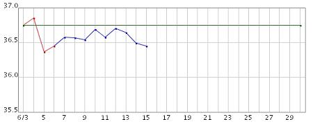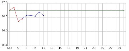 CYCLE DAY 28 36.97 高温期13日目周期28日目・・・・・汗汗汗ちょ・・・ちょっとドキドキしてきましたよ,さすがに。高温期16日の壁を突破したら本格的にわくわく気分を味わえるのですが。と,言うわけで グラフ修正。もともと28日周期(高温期14日)で設定していたので→ 周期32日(高温期17日)に。身体の変化・・・・・ない(* ̄0 ̄*) 乳首痛が。。。ほんの少しだけで あとはいたって普通。あ!!!体重が2kg減りました(^-^)//""パチパチきっと月初からのバタバタとここ数日の異様な暑さで体が絞れたんでしょう。ちょいマゾッ気があるんでどんなに暑くてもエアコンつけないで汗の出るまま・・・・・・放置扇風機は使いますけどね。家の中で熱射病とかいうのはシャレにならないんで。でもって 散々汗かいてからシャワー浴びるという。(これがすんごい気持ちよくてねぇ・・・)水分を頻繁に補給してるので尚更汗をかくのでしょうか・・・・夫くんには「あんまり我慢しないで健康冷房つけなさいね」(健康冷房=ウチのエアコンにそういう設定があります)とか言われながらも気がつけば汗だくで床掃除とかしてたり。だから,ウチでエアコン入れるのは夕方(窓閉めて)から寝るまで。夫くんが暑がりなので つけないわけにいかない。夫くん→冬場は天然湯たんぽになるので重宝してますけど(*^m^*) 寝る時も 扇風機「ゆらぎ」設定(弱よりも弱い)そろそろ窓開けたいですねぇ >夫くん しかし 夕べ・・・・・。むちゃくちゃ寝苦しかったの。(夫くんは爆睡)30分単位に目が覚めてあっち向いたりこっち向いたり冷え性が悩みの私ですが 身体の中から熱気むんむん。いくら扇風機の風がきても中から暑いんだからどうしようもない。結局朝までもごもごしてました。翌日が夫くんのお休みなら起こしちゃったりするんですが(鬼?)さすがに今日は朝から会議と聞いていたので一人で我慢しましたさ。。。。。今夜はちゃんと眠れますように(´∧`)おまけ(*^m^*) 6月29日の晩ごはん をUP☆