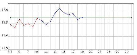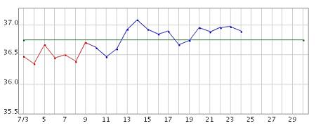 ♥ ♥ CYCLE DAY 29 36.73 高温期19日目私は高温になった日を「高温期1日目」として数えています。そうするとキーになる「高温期16日目は7/28」です。今日は人生初めての高温期19日目ですよ?んでも,妊娠検査薬はかすっただけ・・・。しかも数日前に,ほんのちょぴっと。昨日も懲りずに試してみましたがまっちろけさて,そしてここで浮上してきた「排卵ダブル疑惑・・・・・汗」体温が7/18にカクンと下がっています。もし,この日に排卵のやり直しをしているとすると今日は高温期12日目ちゅうことになります。検査薬に反応しないってのは充分ありえる。あらら・・・・・・・。でもって・・この体温推移と下腹部痛。はいっ!!!この説の通りでいけば,妊娠していたらミラクルです♪だって7/18付近って仲良しする時間なんてありませんでしたもの。夫くんの○~くんが1週間以上生き延びていればミラクル♪ミラクル♪おとといの就寝時間23:00(翌日検温時間:朝4時)夕べの就寝時間23:30(今朝の検温時間朝5時)もちろん昨日は9:00頃まで寝直しましたけどね。最近2時,3時が当たり前の就寝時間の我が家にとって2日連ちゃん,夫婦揃って すごい時間に寝ちゃいました☆+++ 今朝の体の変化 +++乳首がむっちゃくちゃ痛い。昨日までは「押すと痛い?」くらいだったのが今朝起き掛けは「パンパンに痛い」状態でした。おっぱいに絡む痛みは 何周期かぶりなのでそれはそれで 嬉しいんですが。今は「押すと痛い?」くらいに戻っちゃったけどね☆さーーーてと。ここから体温が持ち直すのかはたまた リセット するのか。今日か明日には はっきりくっきり するはずです。諦めちゃあ いませんよ(*^ー^*)絶対赤ちゃん授かるんだからっ!!! これからUP予定の日記を忘れないようにMEMOしておこう ☆7/29の「一日の出来事」日記☆7/30にみた「夢」日記☆ごはん日記いろいろ Designed by hana ♥ ♥ designed BY まよ(^-^*)