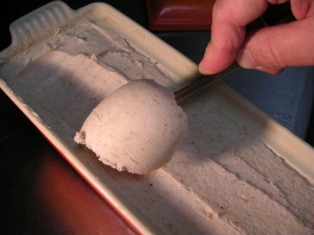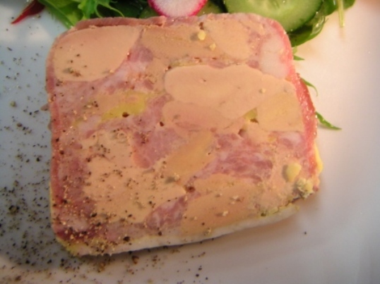 かなり久しぶりに作ったテリーヌ。黒豚の肉を挽いてファルスを作り、豚肉と同じ位の量のフォアグラを混ぜて焼き上げてある。フォアグラは小さめの角切りにして混ぜてある。フォアグラ100%のテリーヌ、黒豚100%のテリーヌ、どちらもシンプルである意味迫力のある味わいなのだが、このように半々に混ぜてみるとある種相乗効果があって、実に美味しいものとなる。また、混ぜ方もこのようにモザイク風に混ぜるのと、真ん中にフォアグラの塊を入れたときと微妙にニュアンスが違うから面白い。今回のこのテリーヌは一切れ切って食べて見ると、我ながら上出来でとても美味しかった。