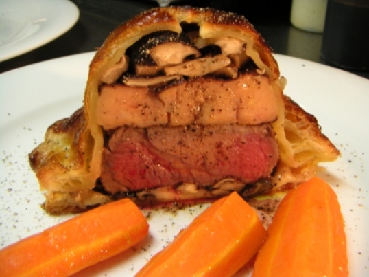 この料理は、言わば牛ヒレ肉のロッシーニ風をパイ包みにしたもの。合わせたワインは、ドメーヌ・ジョルジュ・リニエのグランクリュ、クロ・ドゥ・ラ・ロッシュの86年。作り手のリニエ氏はこのモレサンドニ村の中ではトップクラスの名人。ブルゴーニュはやはり作り手が良くないと話にならない。で、そのようなワインにはやはり飛び切りのご馳走ということになる。下から、きのこ、牛ヒレ、フォアグラ、きのこと重ねてパイで包んで焼き上げてある。上手に火を通すのはものすごく難しい料理だ。お馴染みのお客様でなければできないなぁー、、。a href="http://pt.afl.rakuten.co.jp/c/019cce68.187a675f/?url=http://www.rakuten.co.jp/wss/368895/408068/621245/#620766" target="_blank">