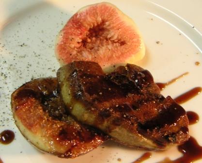 フォアグラに無花果です。この無花果は自宅の庭の木から毎年今頃数日に数個づつ取れるもの。フォアグラのソテーにローストした無花果とフレッシュの無花果を添えてある。
