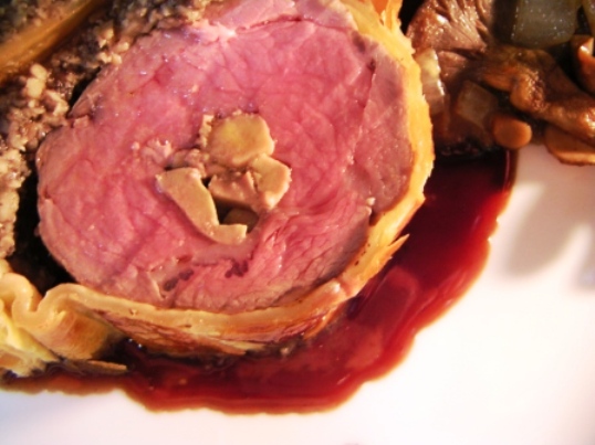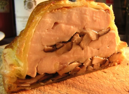 これは大御所城悦男氏のスペシャリテ。 本来は、トリュフが入るのだがまだ時期でないので入れなかった。 骨付きの仔羊の背肉は塊で約1キロ。その肉から骨や脂身や筋をはずした赤身だけの芯の肉は約300グラムしかない。取り外した骨と筋はオーブンでこんがり焼いてから出汁をとりソースのベースにするから、1キロの肉のエキスは全て食べきっていただくことになる。仔羊の芯は細い(500円玉ほど)ので、一本の芯の肉を半分に分けてから、半分の肉は薄く開いて残りの肉に巻きつけて太くして焼く。中心にフォアグラのテリーヌを入れる。仔羊の出汁はあくと脂をとりながら良く煮詰めて、フォンドヴォーや赤ワインとあわせてソースを作る。近頃、パイ包みのリクエストが多い。食べてみたい方は、お店のページを見てくださいね。ホームページ