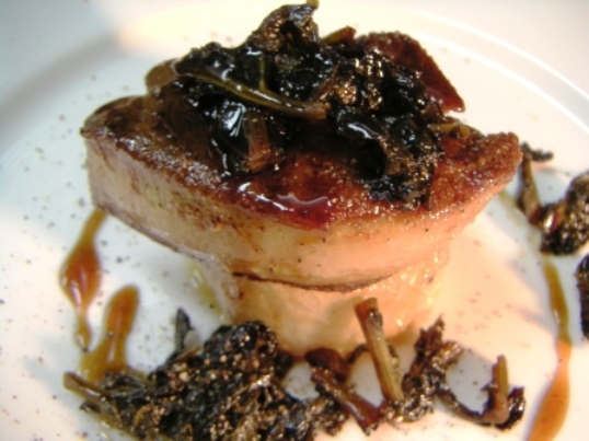 大根は、米のとぎ汁で完全に柔らかくなるまでゆでる。よく洗ったあと、薄味のチキンコンソメで味を含める。野菜の煮物は温度が下がって行くときに味がしみこんでゆくので、コンソメに入れて沸かしたらすぐ火を止めてじっくり味をしみこませる。これをバターで焼いて、上にソテーしたフォアグラを乗せる。周りに散らしてあるのは、大根の葉を蜂蜜とバルサミコと少しの醤油で炒め煮にしたもの。美味しい。