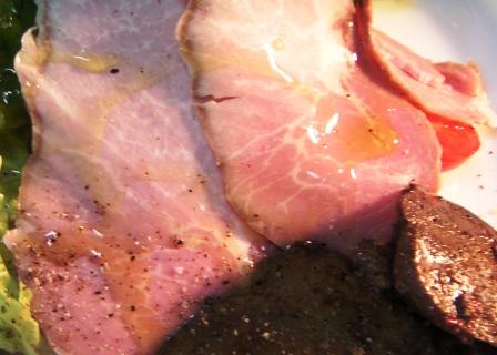 今回のボジョレーコースで思いのほか評判が良かったのがこの自家製ロースハム。材料は豚肉と塩だけなのだが、火の通し方に秘密があってとても柔らかでしっとりとして美味しい。 豚肉はフランス地中海のカマルグ産の塩で3日間ほど漬け込んでから、オーブンシートのシリコンペーパーで包み、さらにアルミホイルで包んで100度ほどの低温のオーブンで5時間近くかけて火を通すのだ。カマルグの塩には天然のミネラル成分がたっぷり含まれているので、発色剤など使わなくてもほんのりロゼ色になる。 日頃普通のスーパーでハムやソーセージを買って食べたりして思うのだが、日本のシャルキュトリー(豚肉加工品)のレベルは低いですねぇ、、、。美味しく食べられるものがほとんど無い。それに添加物を使い過ぎ!pH調整剤、旨味調味料、増粘多糖剤、ソルビン酸、発色剤、、etc。普通に料理を作るうえでまったく必要としないものばかりじゃないですか!肉と塩だけで美味しければほかに何もいらないですよね!