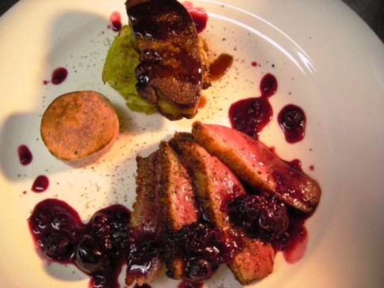 この鴨は、バルバリーと言う種類でフランスの食用鴨では最も一般的な種類。その中でもこれは、雌の若鴨の胸肉で一番柔かくて美味しい肉。4月のおすすめコースのメインで使っています。 鴨肉についてちょっと話しましょう。鴨というのは、厳密に言うと真鴨のことで、本来は野生動物。これを古来より飼いならして、品種改良してきた物が家の鴨と書いて家鴨(アヒル)なわけです。合鴨とも言いますね。合鴨は、アヒルと鴨の掛け合わせなどと言う場合もありますが、要は純粋なのは真鴨で他は全てアヒルや合鴨のたぐいなわけです。 うちの店では、通常シャラン産の窒息鴨を使っているのだが、これは300年くらい伝統的に使われているシャラン特有の品種。それから、この画像のバルバリー種、それからフォアグラ用の品種としてミュラール種がある。ミュラールの鴨を太らせてフォアグラを作り、フォアグラを取り出した後の肉はマグレと呼ばれる。そのほかにも北京ダックのように皮の美味さを追求して出来た品種もあるし、日本の合鴨はかなり野生種に近い感じの物もある。 シャラン産の窒息鴨よりさっぱりしているこのバルバリー種の若鴨の雌の胸肉には、ダークチェリー、フランボワーズ、ブルーベリーなどの赤い果物を使ったソースで軽く仕上げる。煮切るだけで煮詰めない赤ワインとフルーツ、少しの砂糖とフランボワーズヴィネガーで作る軽いソース。クラシックな作り方だと、砂糖を焦がしたカラメルやジャムに煮詰めた肉汁やフォン・ド・ヴォーなどがたっぷり入るのだが、これは正反対に非常に軽いソース。軽くて若いブルゴーニュなどと合わせると美味しい。