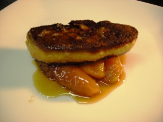 生牡蠣はちょいと置いといて、、、。リンゴが出てきましたね。サンク・オ・ピエのフォアグラといえば、やはりソテー!!? フォアグラには焼きリンゴ!合いますよねぇ。そして、合わせるワインはもちろんヴーブレィ。 もちろん、ヴーブレィ周辺のコート・デュ・レイヨンなどのシェナン・ブランの葡萄から作ったやや甘口のワインならどれもよく合う。シェナン・ブラン特有のリンゴフレーバーと他の葡萄品種には無い爽やかな酸味が、フォアグラのとろりとしたコクとリンゴの甘さ酸味や香りと渾然一体となるのだ。 よく生半可なワイン通ぶる人が、甘口の白ワインなんて飲めないよ!と、バカにする向きもあるが、、、。 甘い白ワインをバカにしてはいけませんよ。フォアグラには甘い白ワインが合うんです。ただし調理法によって色々ですがね、、、。 とにかくこの料理に赤ワインはいけませんね。はっきり言って料理がだいなしですね。