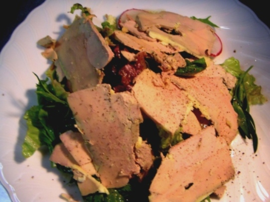 もひとつのパターンは、このように薄切りにしたテリーヌをサラダ仕立てにして食べる。まあ、普通ここまで豪勢にのせませんが、、。(笑)口解けが良いのでシャンパーニュに合います。フォアグラが、スゥーーーっと解けてそれを泡がサーーーっと流すわけです。 シーザースサラダに薄切りのパルミジャーノチーズがのっているでしょう?あの感じです。この上にさらにトリュフの千切りを散りばめればさらにゴージャス。 そこまでやれば、よく熟成したクリュッグあたりを開けたいものだが、、、いったいいくらかかるのやら、、、、、、、。 <続くのか?>