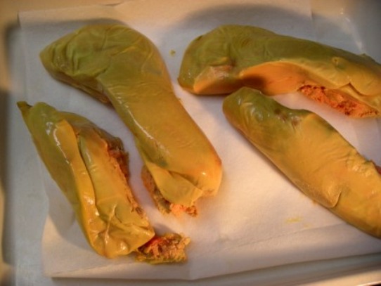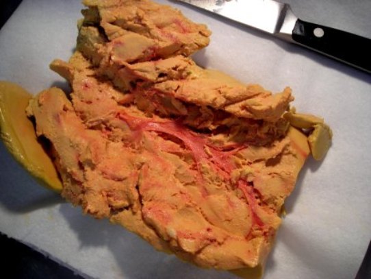 さて、テリーヌを仕込みましょうか、、、。フォアグラは室温に戻して柔かくしてから、デネルベ(筋や血管を取り除く)する。真ん中に動脈が見えるでしょう?これを取り除く。フォアグラは大小二つの部分に分けられるのだが、大きい部分から、血管が2本小さい部分から1本取れる。それからフォアグラ全体の外側の薄皮もはがす。これを調味料をまぶしながらテリーヌ型に詰める。 かものフォアグラは1個約500グラムほど。これを2個使うので、テリーヌ1本で約1キロのフォアグラが必要だ。 型に一杯煮詰めた状態がこんな感じ。これで一晩冷蔵庫で味を馴染ませる。 一日目はここまで。 <続く>