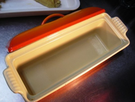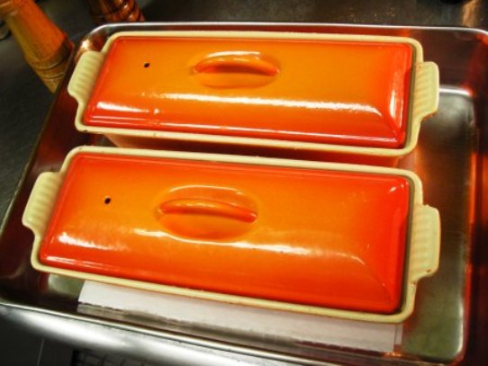さて、下処理が終わったテリーヌを室温に戻してから、湯煎にかけてオーブンで焼く。 この場合、焼くといってもオーブンの温度はせいぜい170度だし湯煎にかけてあるからテリーヌ型の温度はさほど上がらないので、実際は一時間くらいかけてゆっくりと火を通すわけだ。中心の温度がたんぱく質凝固温度である約60度を超えるくらいで出来上がる。 このときに重いホウロウ製のルクルーゼのテリーヌ型の火のあたりの柔かさと熱の余韻の長さがものをいうのだ。ゆっくりと温度が上がり、ゆっくりと冷めていくことによって滑らかな食感のテリーヌができる。 焼きあがるとこんな感じ。透明な脂がでているのがわかるだろうか?フォアグラは約6割以上が脂肪分だから火を通せばこのように必ず脂が出てくる。 Terrine de foie gras au naturel テリーヌ・ド・フォア・グラ・オ・ナチュレルといって、テリーヌの中でフォアグラが脂汗をかきながら自身の脂でゆっくりと火が通ってゆくという、シンプルで自然な調理法だ。このあと、器から脂と煮汁を取り出して透明な脂だけを器に戻し冷やし固める。 固まったところ。脂が完全に空気を遮断してくれる。この状態で冷蔵庫に入れて5~10日間ほど熟成させる。つまり、仕込みから開始して最低でも一週間近くかかることになる。 美味しい食べ方は、、、。 <続く>