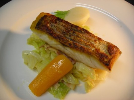 真鱈のポワレ、キャベツ添え。これは、ソースをかける前。このあとブールフォンデュをかける。ブールはバターのこと、フォンデュは溶けているということ(チーズフォンデュというでしょ?)この場合は、水とバターと塩とレモン汁少々をかき立てて乳化させたソース。 仕上げはこんな感じ。鱈は、魚へんに雪と書く冬の魚。漁場も太平洋側なら宮城以北、日本海側なら能登以北なのだが、なんと言っても北海道が本場だ。タラバガニというのも鱈場(鱈がと取れる場所)の蟹というわけで、当然北海道が本場。世界的にいうと北極海周辺の魚だ。 鱈はヨーロッパでも重要な魚で、本来は鱈など取れないスペインやポルトガルまた南仏またはイタリアなどの地中海沿岸諸国では、塩鱈の食文化圏だ。特にポルトガル料理において塩鱈の役割は大きい。日本では、塩鮭や塩鰤などあるいは烏賊を始めとして様々の塩辛の文化があるが、西洋ではまあ、そういうものはアンチョビと塩鱈くらいなものか? ポルトガル料理においては、塩鱈が無いと半分以上が成立しなくなるというくらいらしい。 昔は保存のために強く塩をしたのだが、やはり鱈のような水分の多い魚は軽く塩をすると余分な水分が抜けて旨味が凝縮されるのだ。 だから鱈は一塩してから使うのが私のやり方だ。澄ましバターでソテーしてキャベツのブレゼを添えて召し上がっていただく。