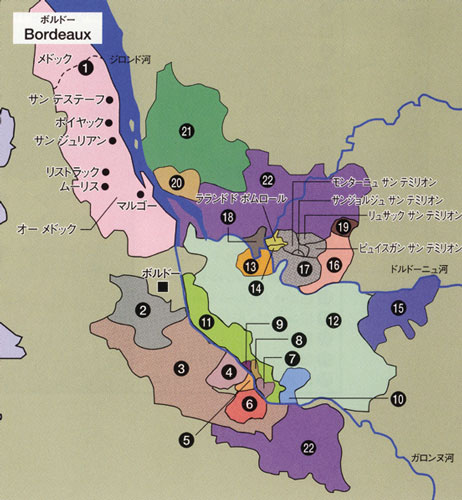 これは、ボルドーの地図。12番の地域がアントルドゥーメールだ。二つの海の間という意味ののこのワインは、ガロンヌとドルトーニュの二つの大河にはさまれているので、その河を海に見立てたのだろう。ソーヴィニヨン・ブランを主体とした、軽くて爽やかなワインが造られている。値段もカジュアルけっして高くないワインだ。このワインも牡蠣に合うといわれている。 ボルドー市から真西に海岸に向かうと、アルカッションの生牡蠣の産地がある。高級ブランドではないが、ボルドー地区ではほぼ一年中食べられる美味しい牡蠣だ。これを地元の人たちは、たいてい熱々のソーセージとバターを塗ったライ麦の黒パンを添えて、生牡蠣と交互に食べるのだ。しかも、軽めの赤ワインを飲む人もいるし、ルーピヤックやソーテルヌの貴腐系の若くて安め甘口白ワインを飲む人もいるようだが、地元の人はあまり辛口白ワインは飲まないようだ。ボルドーのオイスターバーや牡蠣が自慢のビストロなどでは、ソーセージや黒パンが牡蠣とセットメニューになっている事が多い。おそらく、食べる順番がかなりものをいうような気がするのだが、、例えば、生牡蠣→バター黒パン→ソーセージ→赤ワイン→バター黒パン→生牡蠣。とかソーテルヌ→ソーセージ→黒パン→生牡蠣→黒パン→ソーセージ。のような順番があるのではないかという気がする。もっとも、そういう能書きを語らせたら、フランス人はきりがないから実のところ、単に好きな食べ物を食べて好きなワインを飲んでいるだけなのかもしれない。そう、ボルドーのような一大生産地の人は、意外にたいして考えずに楽しんでいるのかもしれない。 ボルドーの人たちは、まずボルドーワインしか飲まないのが普通だから、牡蠣にシャブリだのサンセールだのといったところで、よそから取り寄せたワインに高い金を払ってまで飲むわけがないのだ。生牡蠣にあわせてどんなワインが美味いか?なんてやっているのは、ワイン産地ではない大都会のパリの人たちくらいかもしれない。さらに世界中のワインを集めて、どれが生牡蠣に合うか?などとやっているのは、東京の日本人やニューヨーク辺りのアメリカ人くらいだろう。