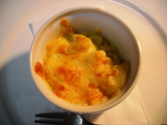2品目は、温菜。ポテトのリヨン風をたっぷりのチーズでグラタン仕立てに、、。 小さな料理だが、うちの自家菜園のジャガイモと玉葱は旨味が違うし、チーズもスイス産のグリュイエールとエメンタールを半々にして使ってあるので、バカにならない美味しさだ。ボジョレーの本場リヨン風の料理なだけに、ワインとの相性も抜群だ! ボジョレーヌーボーを楽しむコース