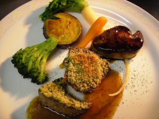 さて、メインディッシュは、もち豚の柔らかタンのパネ、ディジョン産のマスタード風味フォアグラのソテーと自家菜園の有機温野菜添え。 まずは、生産量の少ないもち豚のタンを集めてもらうのに一苦労。何といっても一頭に一本ですからね!そのタンをポ・ト・フのようにやわらかく茹でてから、バターで焼き、ディジョン産マスタードを塗って、ハーブ風味のパン粉をまぶして、さらに焼き上げる。ソースはタンをゆでた煮汁を煮詰めて、焦がしバターで仕上げてある。フォアグラのソテーと自家菜園の秋野菜を添えてある。 もつ焼きのタンと違い、とろけるような柔らかさと香ばしくカリッと焼けたパン粉の対比が面白く、しかもディジョン産マスタードが上手にボジョレーを導いて、料理とのマリアージュも心地よい。ここでは、脇役となっているフォアグラのソテーも忘れないでほしい! ボジョレーヌーボーを楽しむコース