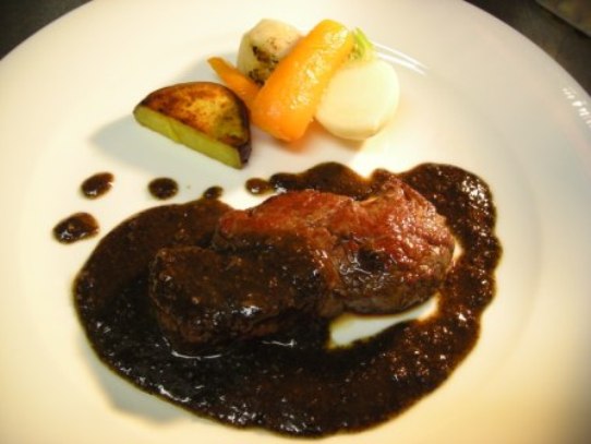 牛ヒレのステーキにきのこのソース。ぱっと見、トリュフみたいでしょ? これは、ブラウンマッシュルームのデュクセルソース。デュクセルとは、マッシュルームをみじん切りにして、バターでゆっくりと2時間くらい炒めたもの。きのこというのは、90%がたが水分なので時間をかけて煮詰めると量は物凄く減るのだが、その分旨味は凝縮されるわけだ。ブラウンマッシュルームは最近房総産のものが手に入るので良く使っているのだ。