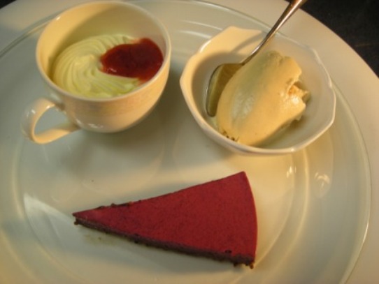 お楽しみのデザートは3種類!まずは、カシス&ショコラ、柔らかめの生チョコと酸っぱいカシスの組み合わせ。 マロン・オ・レのソルべは、フランス産の栗のピュレをミルクで伸ばしたシャーベット。 クレメ・ダンジュは、生クリームチーズ(フロマージュブラン)と発酵生クリームで作ったチーズのムース、夏に作って冷凍しておいた、自家菜園の苺のコンフィチュールを添えて召し上がっていただく。 ボジョレーヌーボーを楽しむコース