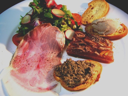 今年のボジョレーコースの全貌。まずは前菜。真ん中上は、自家菜園の有機野菜のサラダ、左から養老渓谷産もち豚を使ったシェフ特製のスモークハム、次は、地鶏レバーのクロスティーニ仕立黒オリーヴとアンチョビのタプナード風味。その隣が、シャラン産の鴨のリエット(リエットとは、鴨と豚バラ肉を80度ほどのラードでゆっくりと4~5時間煮込んで煮崩した物をペースト状に練って固めた物)、そしてシェフ入魂の生ベーコン。盛りだくさんで美味そうでしょ?私ならこの一皿で、一本いけますよ!! ボジョレーヌーボーを楽しむコース