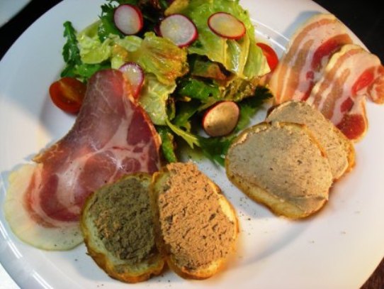 これは、去年の前菜盛り合わせ。ボジョレーヌーボーは、ブルゴーニュの南部の新酒を愛でるリヨン辺りのお祭りが元祖。 リヨンには、ローヌ川とソーヌ川が流れているのだがもう一本ボジョレーのワインの川が流れているというくらいで、リヨンの人たちはボジョレーが大好き! 軽くてサッパリしたボジョレーは、日常的な惣菜と相性が良い。もちろん、惣菜といってもフランスの惣菜だから、ソーセージやハム、テリーヌやリエットといった物になる。 そういった、つまみをあてにぐびぐびやるのが、ボジョレーヌーボーの醍醐味といえる。だから、毎年うちの店の「ボジョレーヌーボーを楽しむコース」は前菜重視なんです。 さあ、来週の木曜日はいよいよボージョレーヌーボーの解禁日です! 今年のヌーボーの出来も上々のようで、期待できそうですよ。あまりマスコミが騒がないのでワイン業界全体としては、地味な展開になりそうだという話も聞きますが、サンク・オ・ピエのヌーボーコースで今年もヌーボーを愛でてください! ホームページにもアップしましたが、コースの内容をお知らせします。 前菜は今年も5種盛り合わせ!まずはシェフ入魂の手作り生ベーコン、2ヶ月かけて熟成させました。 そしてシャラン産の鴨のリエット(パンに塗って食べる鴨ペーストです) 地鶏レバーのクロスティーニ、タプナード風味(アンチョビや黒オリーヴ風味のレバーペースト) さらに定番のシェフ手作りもち豚のスモークハムと自家菜園の有機サラダをたっぷり添えて、テンコ盛りの前菜盛り合わせです。 2品目は、温前菜。ポテトのリヨン風をベースにしたチーズたっぷりのグラタンです。何といってもボジョレーは、リヨンの地酒ですから、リヨン風の料理は欠かせません。 3品目は、メインディッシュ。このメニューのために特別に用意してもらったもち豚のタンを使ったお料理です。 タンをポトフのように柔かく茹で上げてから、切り分けディジョン産のマスタードを塗ってから、ハーブ入りのパン粉をまぶして香ばしく焼き上げます。 有機温野菜とフォアグラのソテーも添えた豪華版!ディジョン産マスタードもリヨン風料理の定番ですね! お楽しみのデザートは3種類!まずは、カシス&ショコラ、柔らかめの生チョコと酸っぱいカシスの組み合わせ。 マロン・オ・レのソルべは、フランス産の栗のピュレをミルクで伸ばしたシャーベット。 クレメ・ダンジュは、生クリームチーズ(フロマージュブラン)と発酵生クリームで作ったチーズのムース、夏に作って冷凍しておいた、自家菜園の苺のコンフィチュールを添えて召し上がっていただきます。 もちろん、ボジョレーヌーボーもいつも通り2種類要しました。 果実味炸裂のコラン・ブリゼ社のBeaujolais Village Nouveauと、バランスが抜群なアルマン・ダルトワ社のBeaujolais Village Primourです。 このコースはご予約のみで、ボジョレーが売切れ次第終了ですのでお早めにご予約ください! 皆さんのご来店をお待ちしております。 サンク・オ・ピエ chef 中村雅信