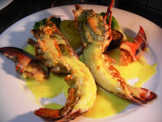 活きたオマールを縦割りにして最強のオーブン(300度以上)でさっと焼き上げる。ソースは、ユズバターをベースにしてある。ユズバターというのは、バターをポマード状に室温に戻してから、ユズの皮のみじん切りを混ぜ込んだ物。このときユズの皮の白いところは絶対に入れてはいけない。黄色の表面の部分だけを使うのだ。よく切れるナイフで、表面だけを切り取って使います。 白ワインとエシャロットを一緒に煮詰めて鍋底にくっ付きそうになったところで少し水を足してユズバターを分離しないように混ぜ込んでゆく。火は普通は弱めで行うのだが、私の場合は強火で作ってしまう事もある。(普通は分離してしまうので、弱火でゆっくり行う) とろりと乳化したユズの香りのバターを焼きたての海老にたっぷりかけて、、、じつに美味しい! ユズも含めて、柑橘類の香りは皮の表面に一番多く含まれているのだが、そのすぐしたの白い部分は苦味が多いので注意が必要。レモンなどを絞るときもあまり力を入れすぎると白い皮の苦味が出るので、絞りすぎは良くない。なお、輸入物のレモンやオレンジは、皮に防腐剤やワックスが使われている事が多いらしいので、注意が必要だ。