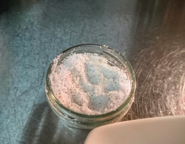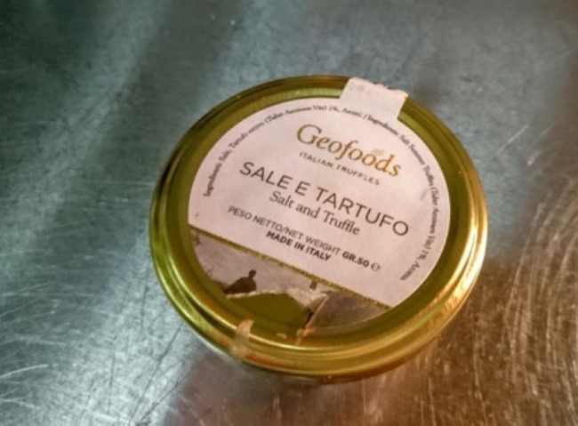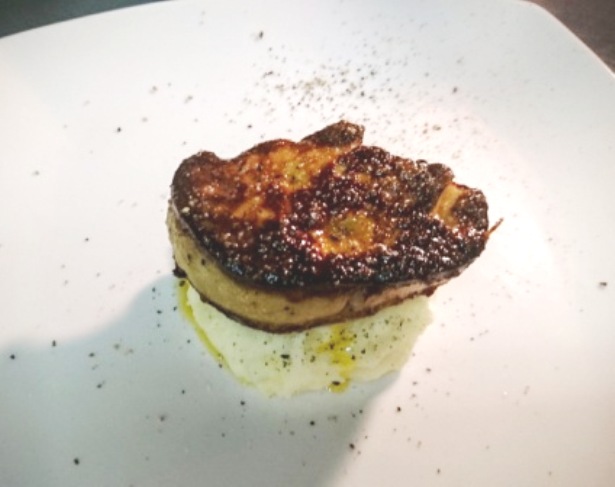 Foie gras chaud avec puree de pommes de terre Parfume sel truffee フォアグラのソテー、自家菜園のジャガイモのピュレ添え トリュフソルトの香りです。この時期、サマートリュフも出ているのですが、キロ当たり3万以上する割にはたいした香りもなく結局こういったトリュフソルトやトリュフオイルなどで香りを補強しないと使えないんです。