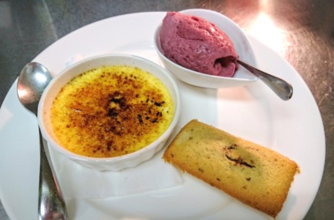 Creme brulee aux peche jaune Financier aux noisettes roti Sorbet aux raisins sauvage 黄桃入りのクレーム・ブリュレ、ロースト・ヘーゼルナッツ入りフィナンシェ、山形産山ブドウのソルベ、デザートですね。これにはもちろん、、