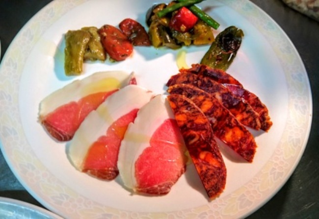 Cote de cochon de ≪ SUINO DI NERO NEBRODI ≫ fume et Chorizo IBERICO BELLOTA domiracion avec Ratatouille et Legumes a ma jardin シシリア島の黒い豚“シーノ・ネロ・ディ・ネブローディ”の自家製ハムと 最高級チョリソ・イベリコ・ベジョータ、ラタトゥイユなど自家菜園の野菜料理色々添えです。 ほとんど、野生のシチリア豚の自家製スモークハムは、イノシシ並みに赤身が強くてみためはワイルドですが、意外にきれいな味わいです。特にくせのないさっぱりした脂は魅力ですね!イベリコチョリソはピメントン(スペイン産パプリカ)が効いていて熟成感と旨味が素晴らしい!ラタトゥイユ、自家製セミドライトマトのマリネ、焼きなすのマリネ、焼きピーマンのマリネなど添えてあります。この皿には、、、
