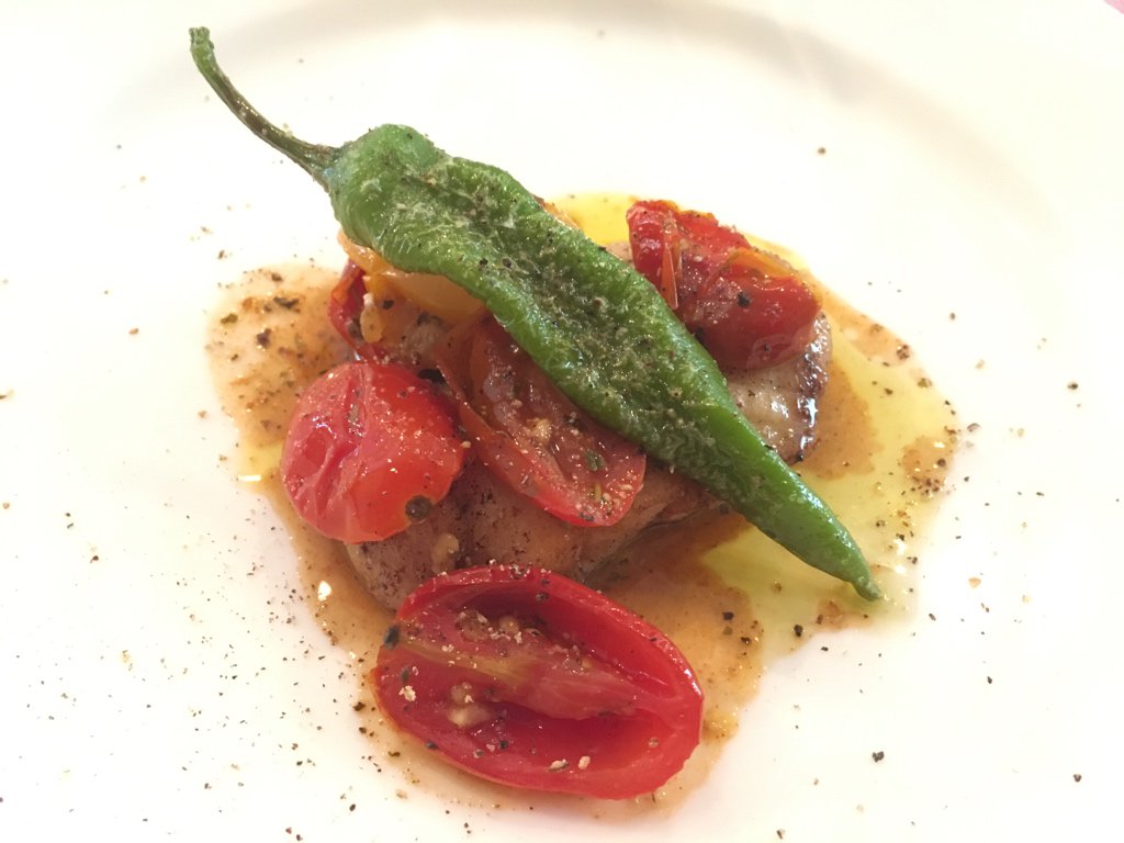 次の皿はクロカワカジキのソテーに自家製セミドライトマトを温めてソース代わりに添えたものです。仕上げにサルディニア島産の極上ヴァージンオリーヴオイルをたっぷり!これにはイタリアプーリアの白ワイン、ラロッカというメーカーで、ソーヴィニヨンブランとピノブランのブレンドでバランスよく飲みやすいタイプでトマトやバルサミコの味わいにぴったりです。