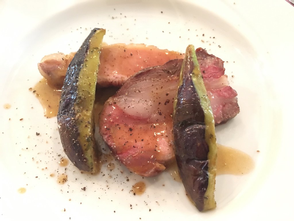 シシリア豚、シーノ・ネロ・ディ・ネブローディの背肉のローストです。茄子のシシリア風(オレガノ風味のソテー)を添えました。シシリア豚は3000年もの間品種改良されていないというシシリアの地豚で非常に原始的品種なので、けっして柔らかくはないんですが、長時間ローストで休ませながらゆっくり火を入れると魅力が出ます。また、軽くきれいな脂も魅力ですね。かなり高級な食材です。これには、やはり相川さんのワインで、シャトー・レゾー・ド・カイユベル、ベルジュラック・エテでした。メルロー、カベルネ・フラン、カベルネ・ソーヴィニヨンの混醸ですが樽を利かせていないので、フィニッシュに葡萄らしい果実味があってそれが綺麗な赤身肉によく合います。