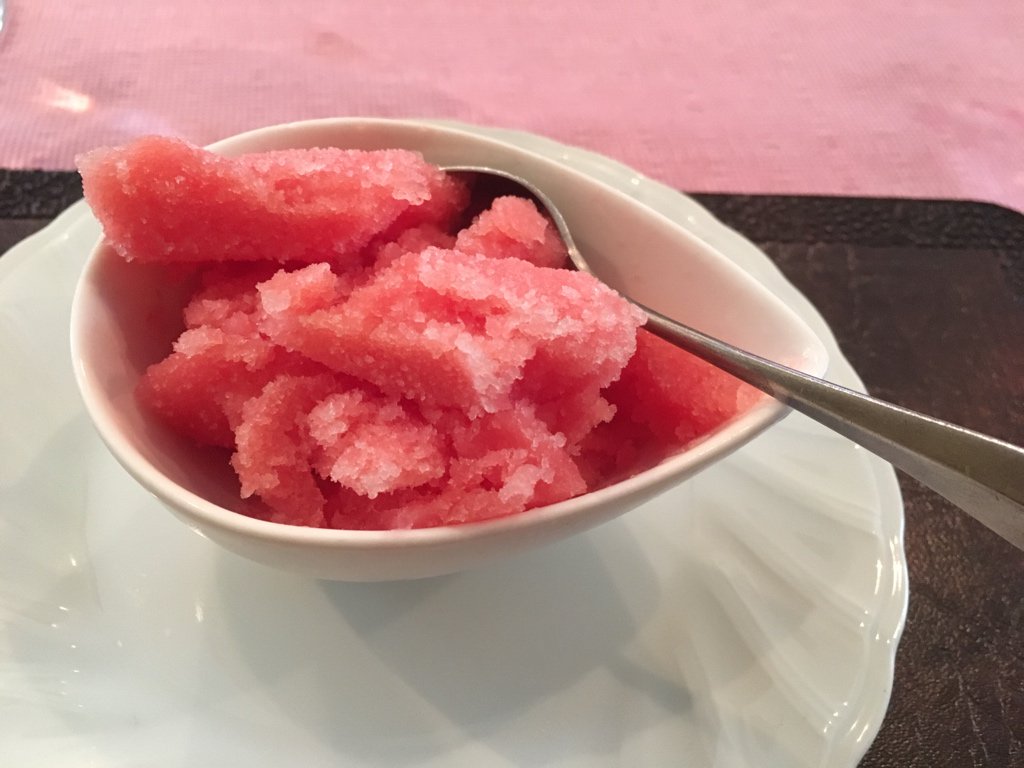 最後は、うちの畑のスイカで作ったソルベ。スイカに砂糖とカマルグの塩が入っています。食べると子供のころ田舎のおばあちゃんの家の縁側でスイカに少し塩を振って食べている気分になります。(笑)