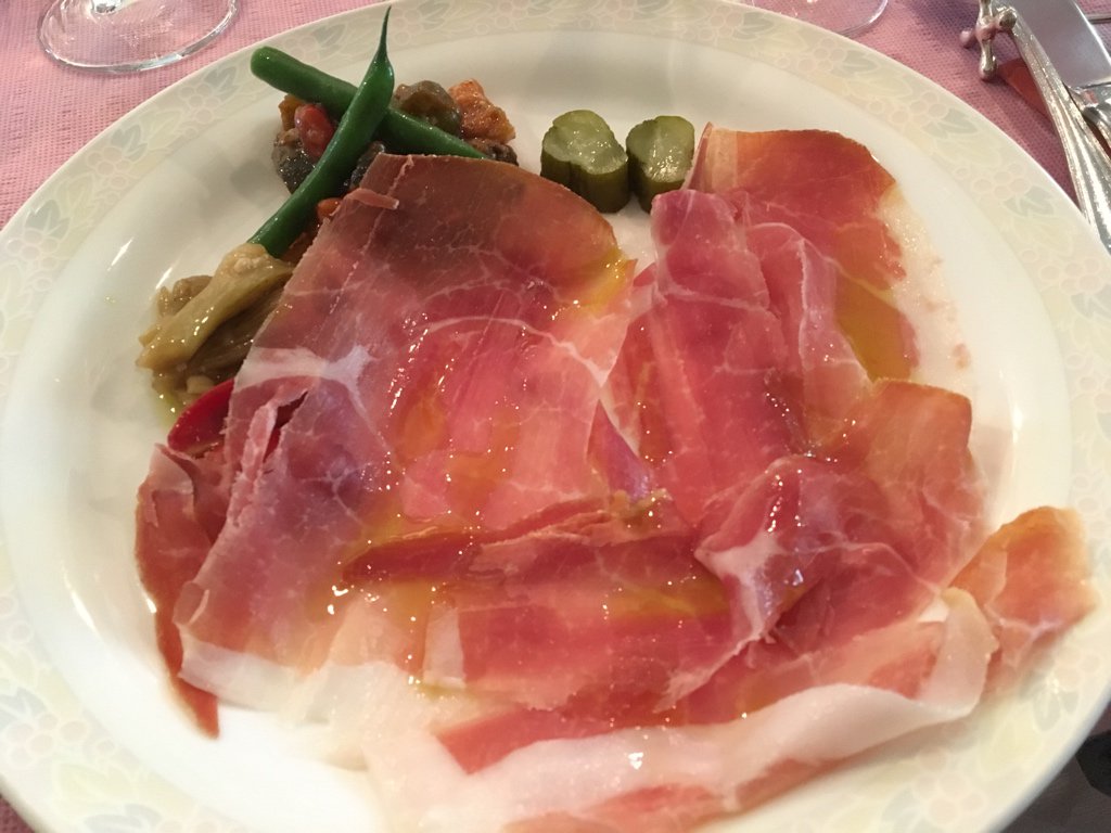 2皿目は、パルマのガローニ社の高級生ハム゛クラテッロ・コン・コテンナにラタトゥイユや自家製セミドライトマト、ピクルスや焼き茄子マリネなど自家菜園の夏野菜料理添え。合わせたワインはシャンパーニュ、シャルル・ド・カザノーヴ・ロゼ・ブリュット。ピノノワールが多めでちょうど生ハムと同じくらいのロゼ色のワインです。料理に色で合わせるというのは意外にありなんです。ソムリエの田崎真也さんも言っていますけれど、例えば平目の刺身なら白身ですから透明に近いような白ワインつまり樽熟成でない若いソーヴィニヨンブラン種とかミュスカデとか、ビーフシチューみたいに赤黒いソースの料理には赤黒い濃い赤ワインカベルネやメルローなどが合うとか、、、生ハムはロゼ色ですから、ロゼワインやロゼシャンパーニュが合うんです。特にクラテッロのような高貴な味わいの生ハムにはロゼシャンパーニュがふさわしいですね!
