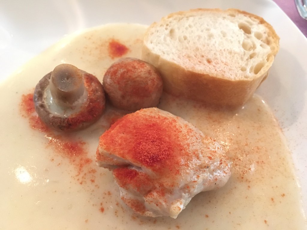 つづいて、ときめき鶏のブランケットです。ブランケットというのはもちろん毛布のことではなく、水から煮込んで作るクリームソース煮のことです。鶏肉をブランシール(湯通し)してから水で煮込んでゆきます。よくアクを取って、肉が柔らかくなったらブ-ルマニエと生クリームで仕上げます。最後にマッシュルームを入れて軽く火が通ったら出来上がり。盛り付けてポルトガル産のトマトパウダーを少し振りました。合わせたワインは、相川さんのところのドメーヌ・オーペロン、トゥーレーヌ・ソーヴィニヨン・クロ・レ・グラン・ヴィーニュです。ソーヴィニヨンブラン種とソービニヨングリ種というちょっと珍しい品種が入っています。以前、仔牛のブランケットに使ったんですが、クリームソースとの相性の良さは抜群です!