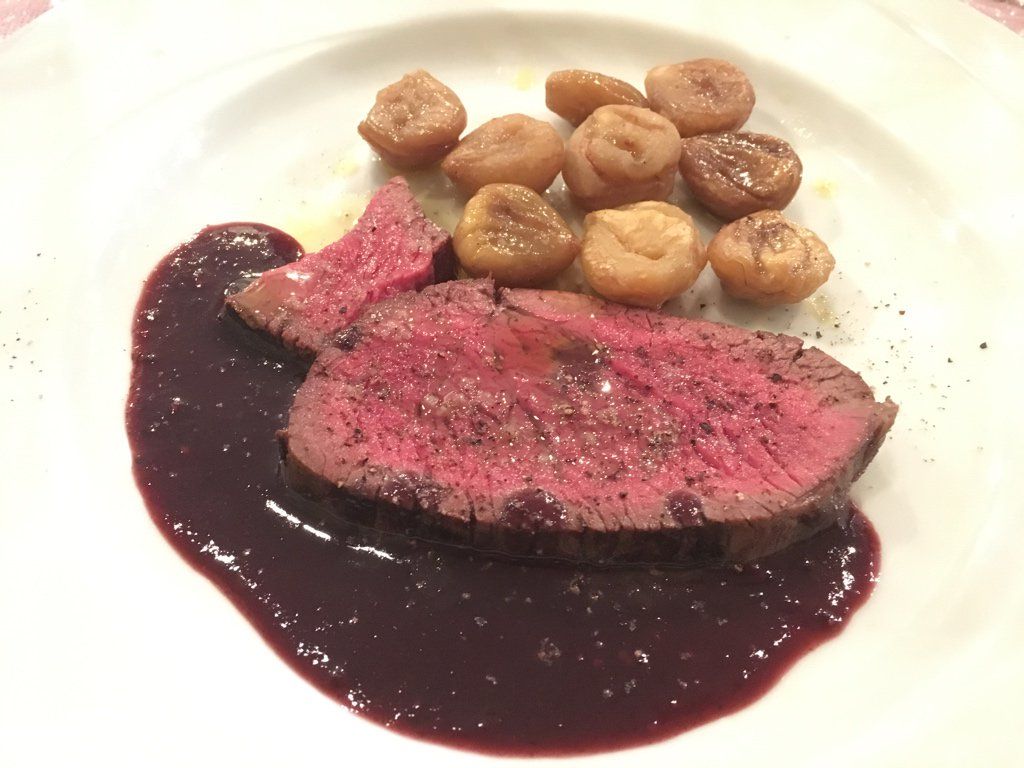 エゾ鹿のローストに山ぶどうのソースと焼き栗添えです。これには、ドメーヌ・ド・ラ・プティット・メゾン・オートのボージョレ・ヴィラージュ・ヌーヴォー、キュベ・アンシェンヌを合わせました。2種類のヌーヴォーを比べるのもこの12月の会の恒例ですね。