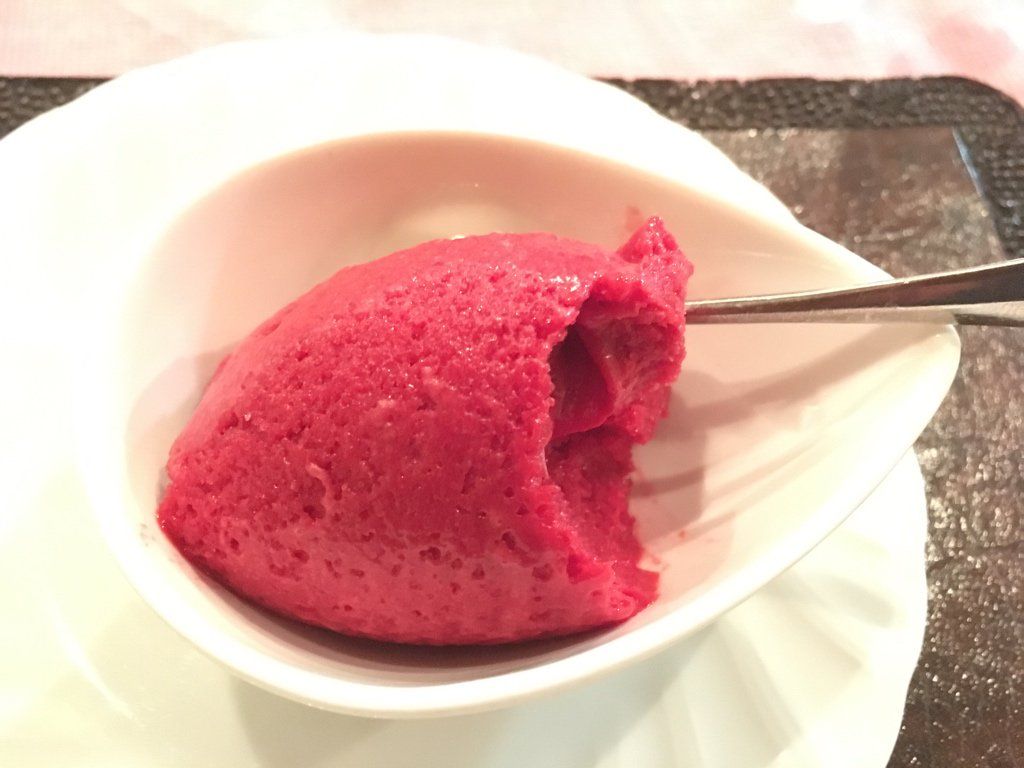 デザートには超濃厚フランボワーズソルベにさかもとこーひーのさかもとさんがお土産に下さった、グァテマラ・エルインヘルト・パカマラ!世界最高峰のコーヒーの一つでお値段もキロ3万!(さかもとこーひー価格、高いところでは4~5万が普通くらい)信じられないことにこーひーなのにベリー系の香りがあるんです。だからこのソルベにもバッチリ!