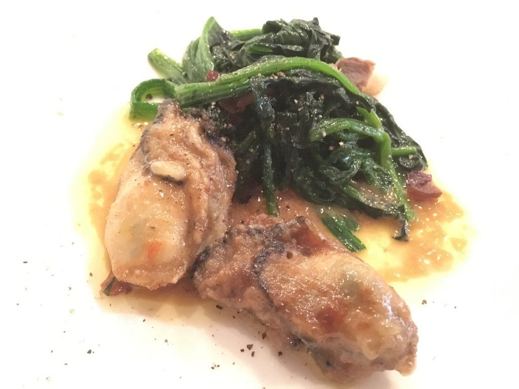 続いて、広島産の牡蠣のムニエルにほうれん草のソテー添え。牡蠣はロックオイスターというスコッチウイスキーでフランベして香りをつけ、ほうれん草は自家製のイノシシのスモークハムの切り落としを入れて、牡蠣のソースにもウイスキーを垂らして、それらにロックオイスターのハイボールを合わせました。スコッチのヨード的なピート香塩気すら感じるくらいのミネラル感が牡蠣にもホウレンソウにもよく合います。CAVE相川おすすめのスコッチです。