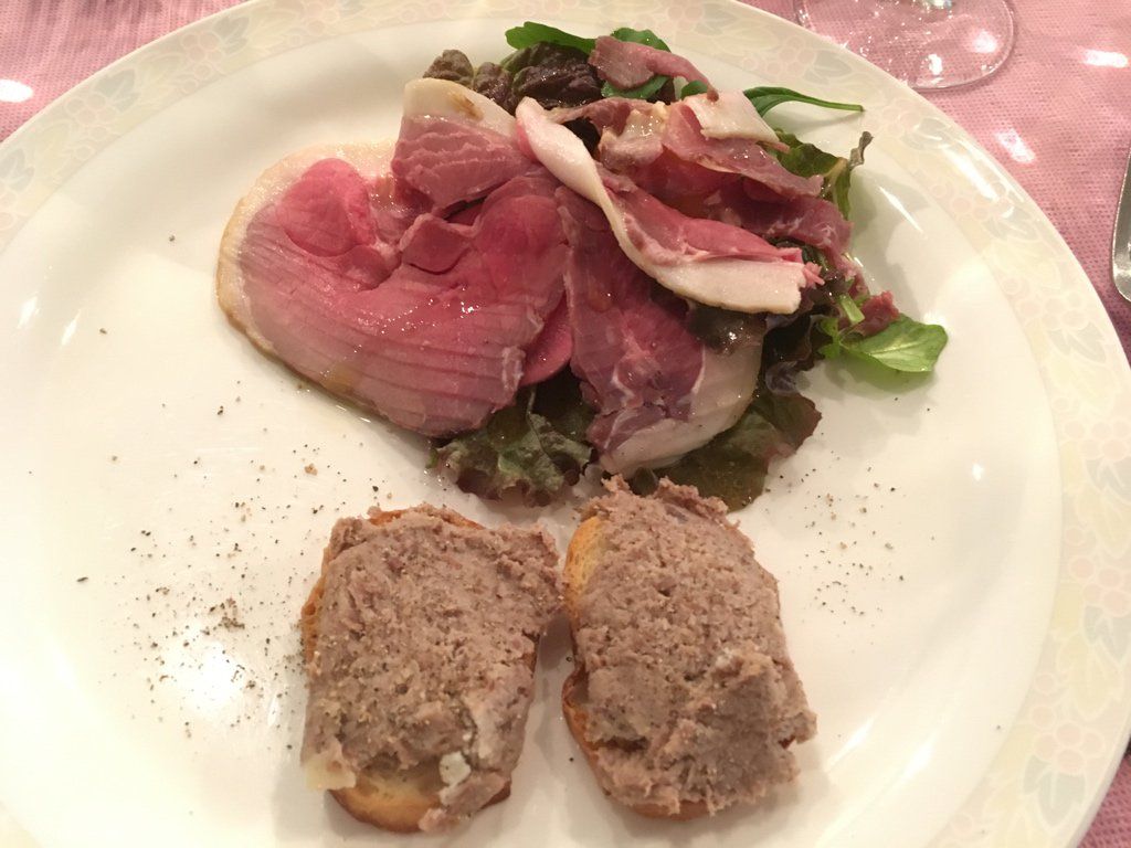 対馬産イノシシの自家製スモークハムとリエット。これには、ドメーヌ・ジャン・モルテのボージョレ・ヌーヴォーを、、。