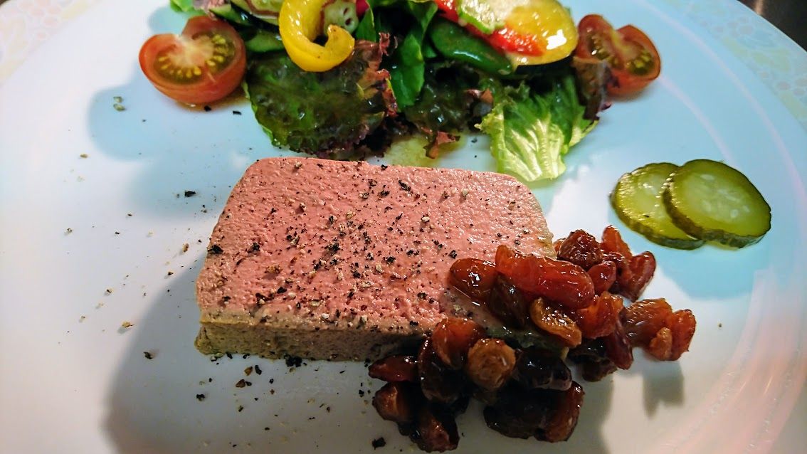 フォアグラがいよいよ無くなってきたので、こんなものを作ってみました。Terrine de Fondant de foie de volaille avec raisin aigre doux地鶏レバーのテリーヌ、フォンダン仕立て、甘酸っぱいレーズンを添えです。これ、実はパリにあるコルドンブルーという料理人養成の調理師学校のレシピを少し変えたものです。鶏レバーと卵や生クリームバターなどをミキサーにかけてシノワで濾してテリーヌ型に流し湯煎にかけてオーブンで蒸し焼きにしたものに 白ワインとシードルヴィネガーと砂糖と蜂蜜とシナモンでコンポートにしたレーズンを添えてます。フランス人はこのような料理を皮肉を込めて「貧乏人のフォアグラ」なんていうこともあります。まあ、フォアグラの代わりにはなりませんが、料理としては結構美味しいですよ。今前菜でやっております。