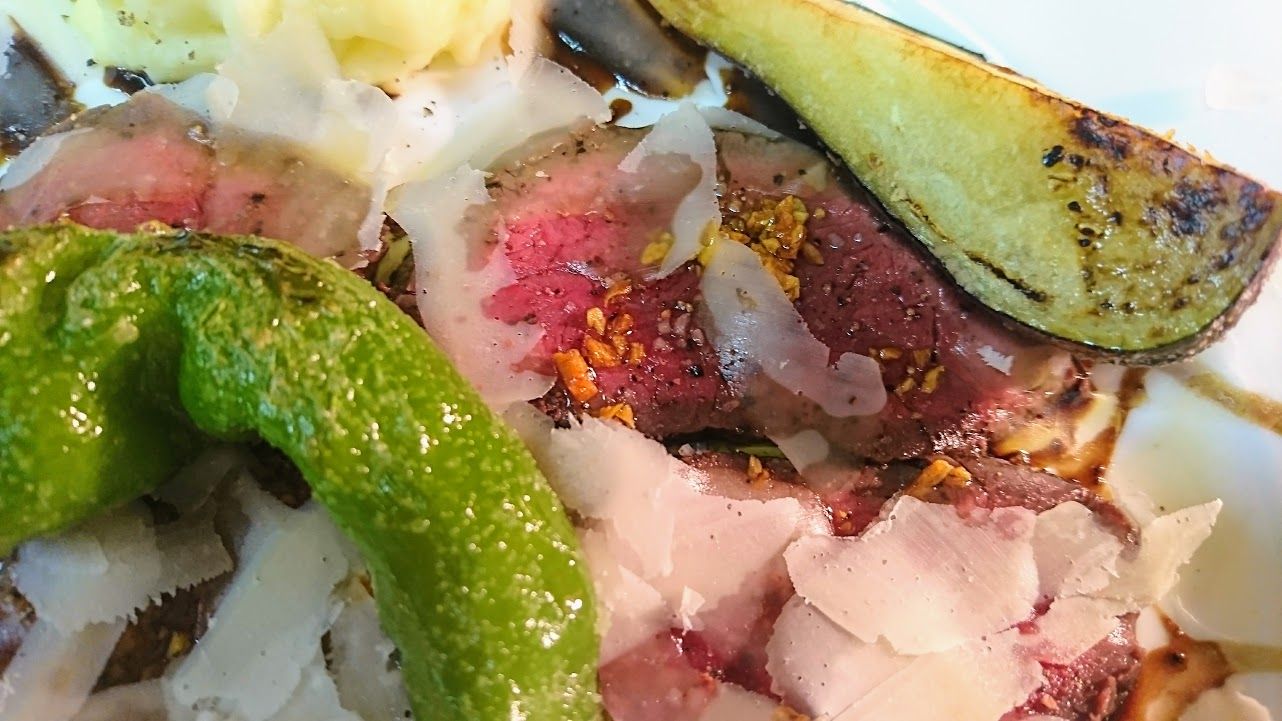 さて、この料理は子供を産んだ後しばらく休ませて再肥育をした黒毛和牛のうちモモ肉を弱火ローストでゆっくり焼き上げて、バルサミコソースを敷いた皿に並べて、ゲランドのフルール・ド・セル(塩の華)をパラリとまいて、黒コショウを挽きかけ、ガーリック風味のオリーヴオイルを垂らして、最後に薄削りのパルミジャーノを散らします。