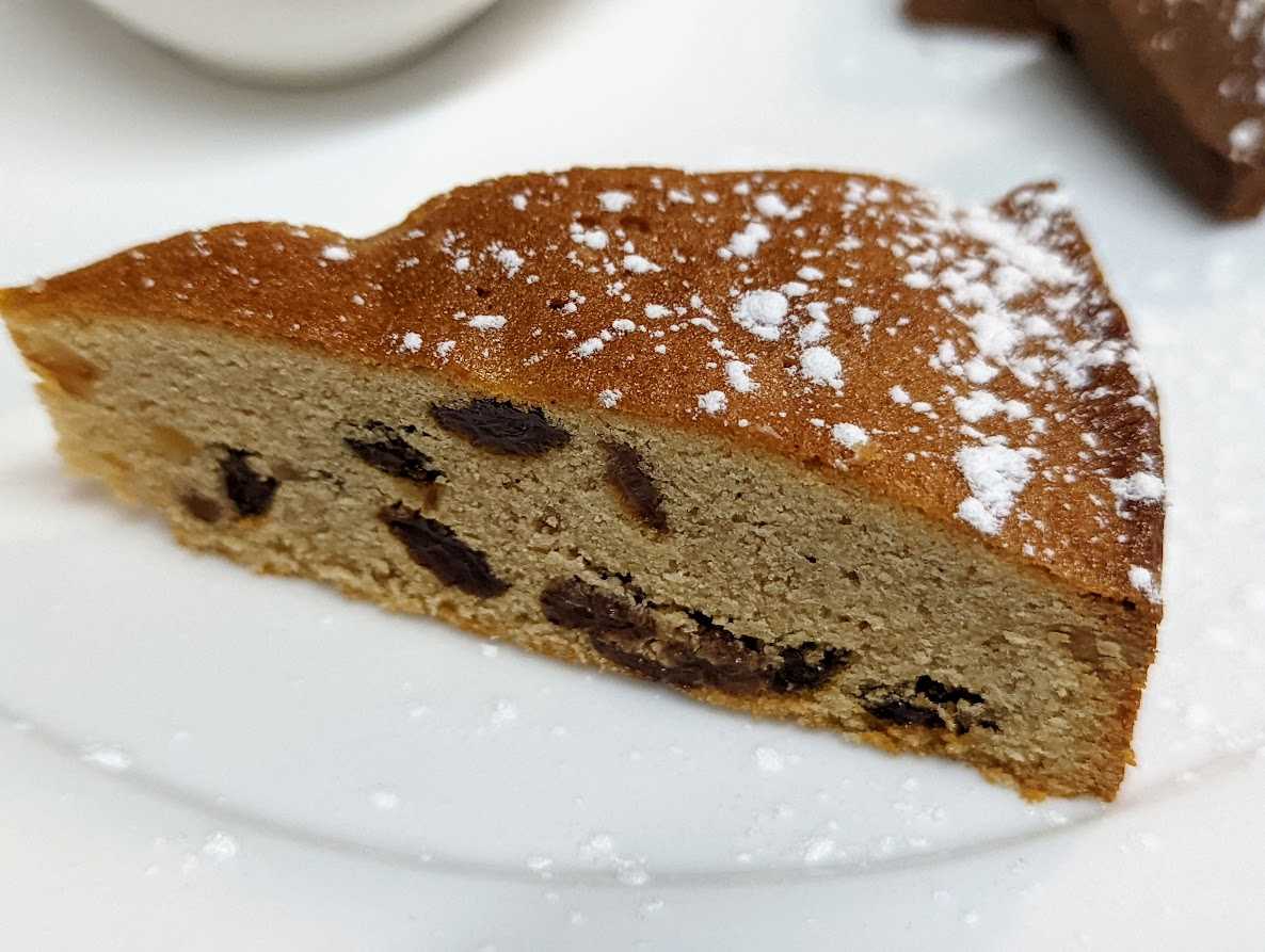 栗とアーモンドの粉を半々の生地で作ったケーキにローストしたクルミとラムレーズン入りです。