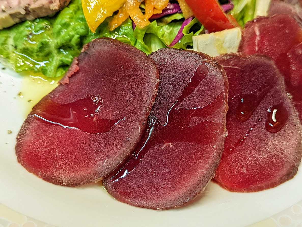 千葉県産の鹿のうちモモ肉を軽く塩漬けして、弱火焼きローストで火を入れます。それを半日スモークにかけます。鹿のスモークハムです。見た目真っ赤ですが、これでちゃんと火は入っています。