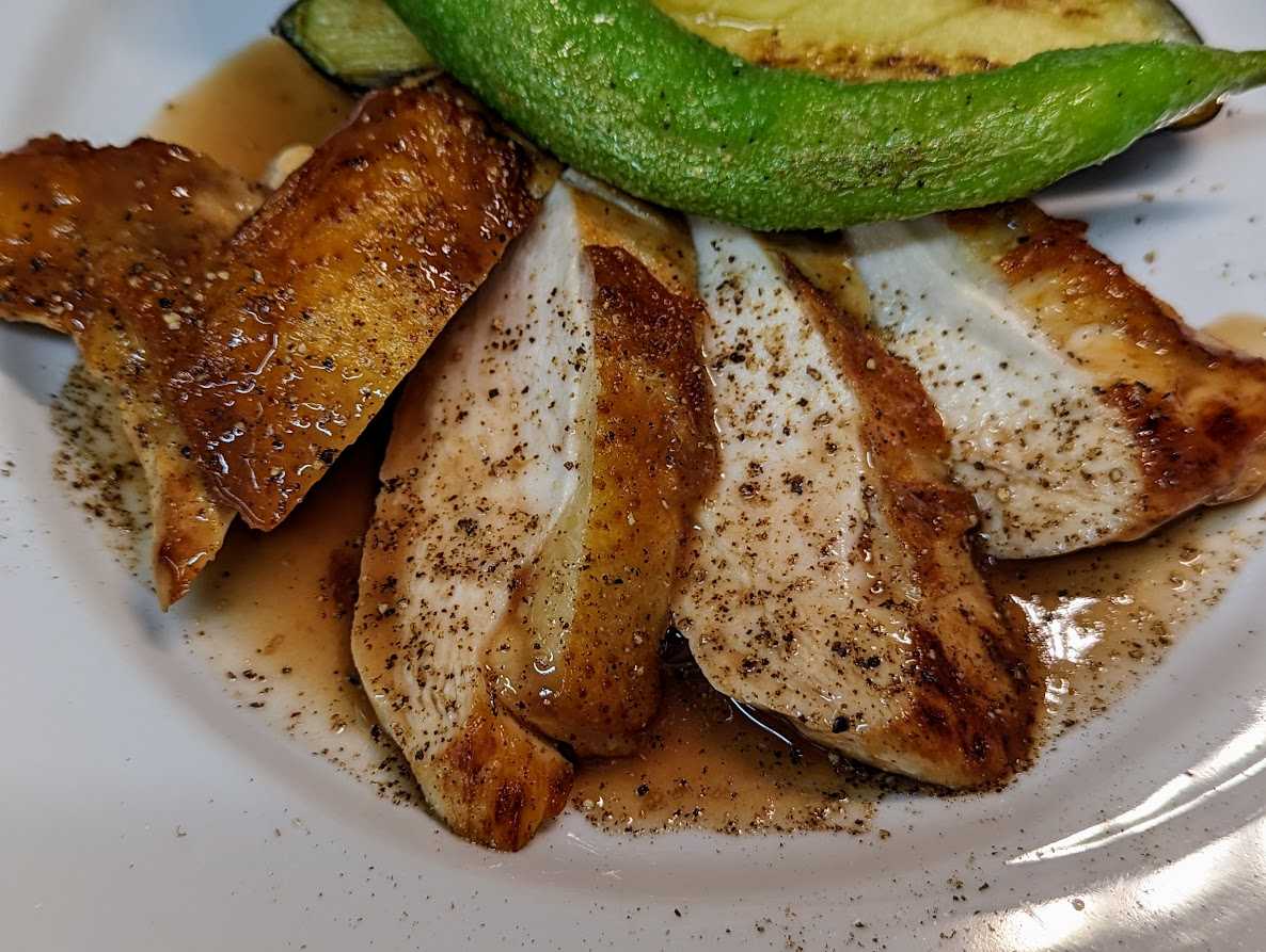 Poulet noir de TANBA poêlée au vinaigre de framboises地鶏丹波黒鶏のポワレ、フランボワーズヴィネガー風味です。