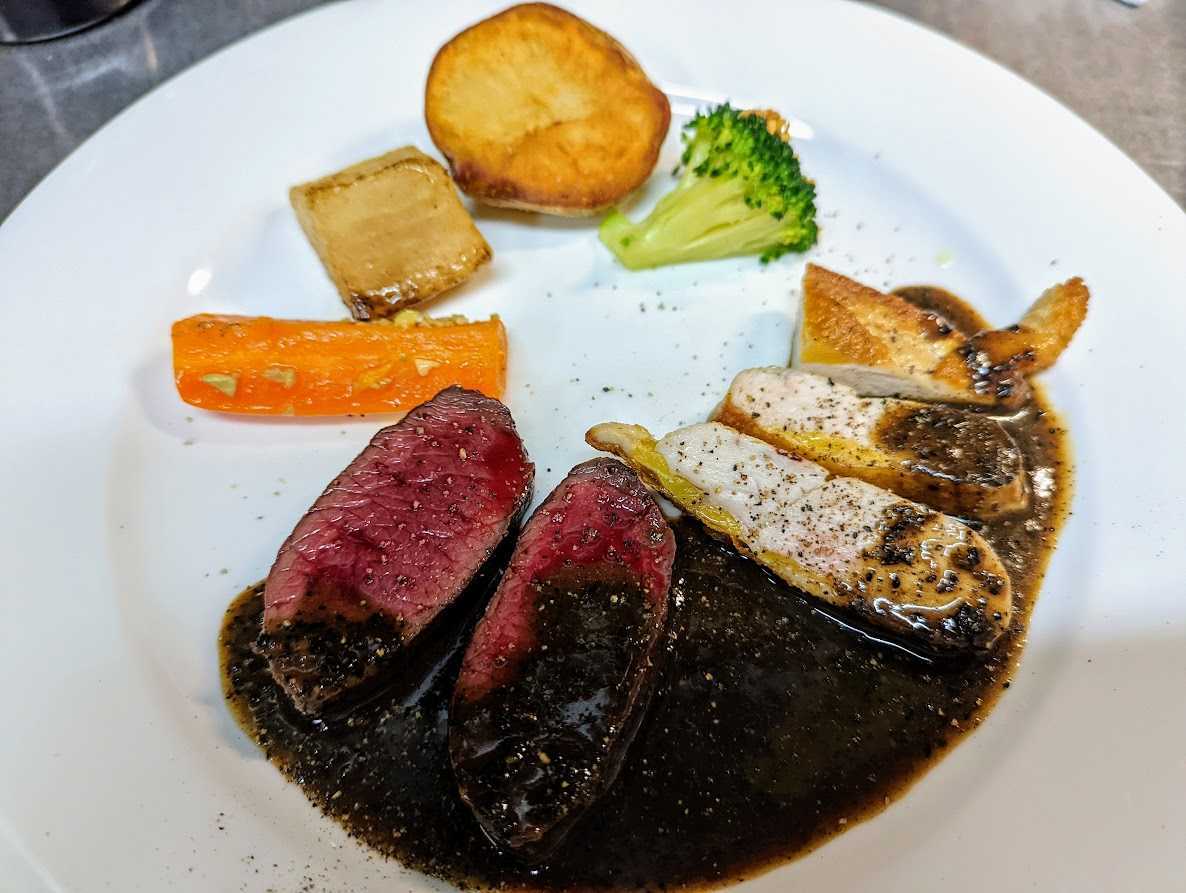 Chevreuil de CHIBA roti et Poitrine de Marcassin sous vide confit et poelee croquant sauce poivrede