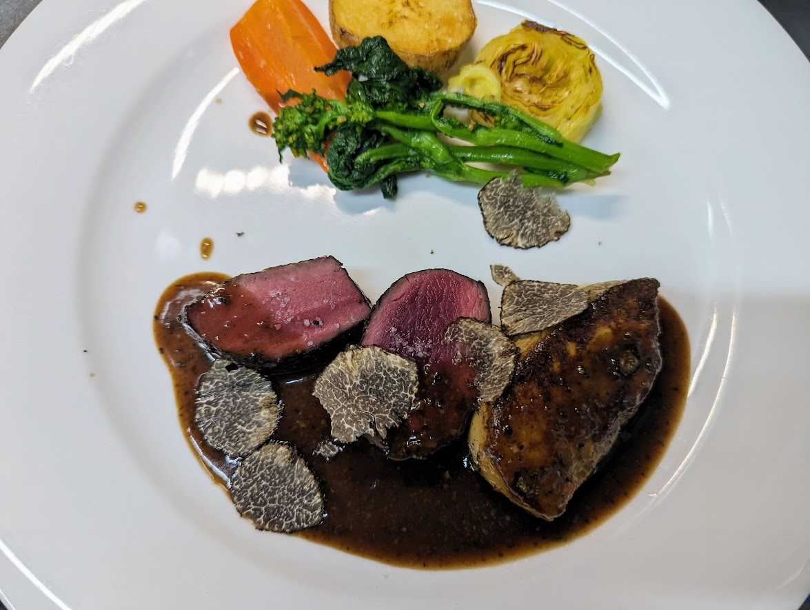 千葉県産の鹿の背肉(サーロインの芯)のローストとフォアグラのソテーにトリュフのソースと仕上げのフレッシュトリュフ!
