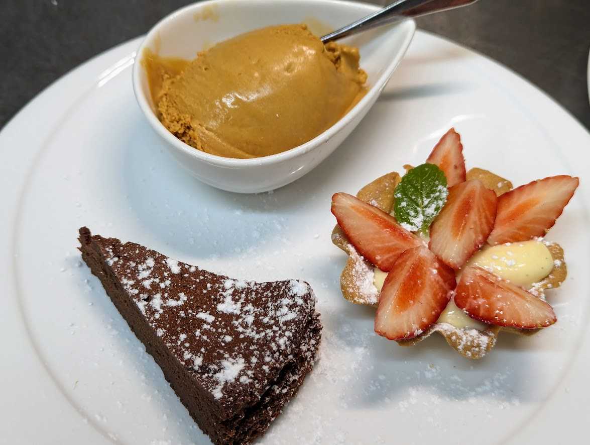 ショコラは、フランスの一流品ヴァローナのクール・ド・グアナラP125という銘柄を使っています。カカオ成分が125%という特殊製法のショコラです。安物のハイカカオはただ苦いだけみたいなのが多いですが、これは違って「本物のショコラというのはこういうものだよ!」という感じのど真ん中の味わいですよ。アイスクリームはカリスマパティシェのピエール・エルメ氏のレシピの塩カラメルアイスクリームです。これを食べると、某HGDッツなんて子供だましかと、、(笑)イチゴのタルトレットは提供直前にクリームを絞って、イチゴを切って載せます。ケーキ屋さんにはできない仕事ですね。