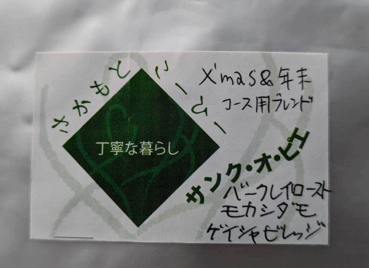 さかもとこーひーのクリスマス&年末コースブレンドです。今回も豪華ブレンドで、お客様の評判も上々でしたね!