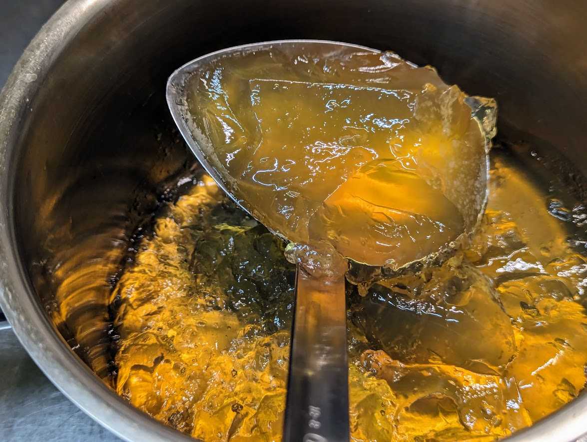 下の画像は冷蔵庫から出したてで、ゼラチン質で煮凝り状態になってます。