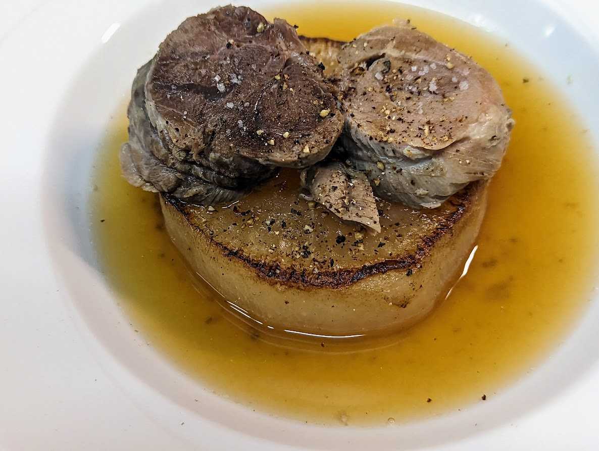 Chevreuil roti et Confit de Poitrine de Marcassin sauce truffe鹿ロースト、イノシシバラ肉コンフィ、トリュフのソース 鹿の背肉(サーロイン)をローストしたものとイノシシバラ肉のコンフィにトリュフのソースです。鹿肉のサーロインはとても柔らです。イノシシのバラ肉のコンフィ。コンフィは通常80℃に保ったラードで煮込んだ料理なんですが、要は水で煮込むと旨味が抜けてしまいますが、脂で煮れば旨味は抜けないという原理ですから、真空パックに肉を入れて80℃のお湯で煮込んでます。要するに80℃に保つことで肉のコラーゲンが分解して、煮込みのように柔らかくなりますが、味は抜けていないという状態がコンフィです。 脂のない赤身の鹿肉と脂があって柔らかいイノシシのコンフィにトリュフのソースの組合わせは最高ですよ!