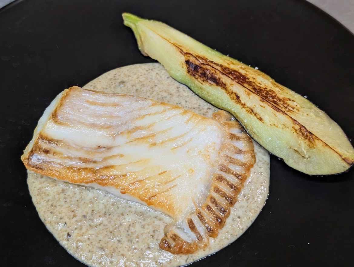 本日の白身魚のポワレ、キノコのデュクセルクリームソース